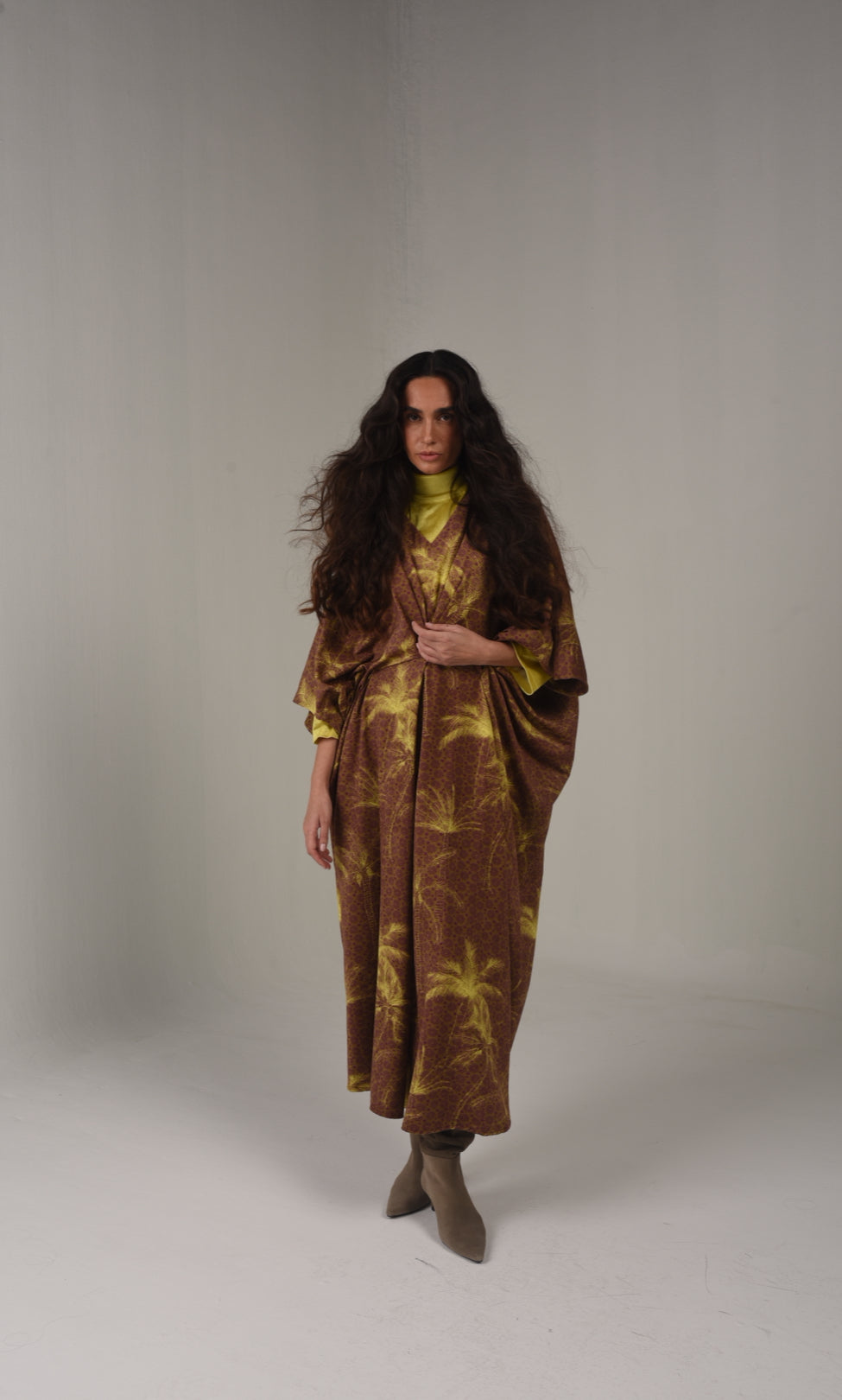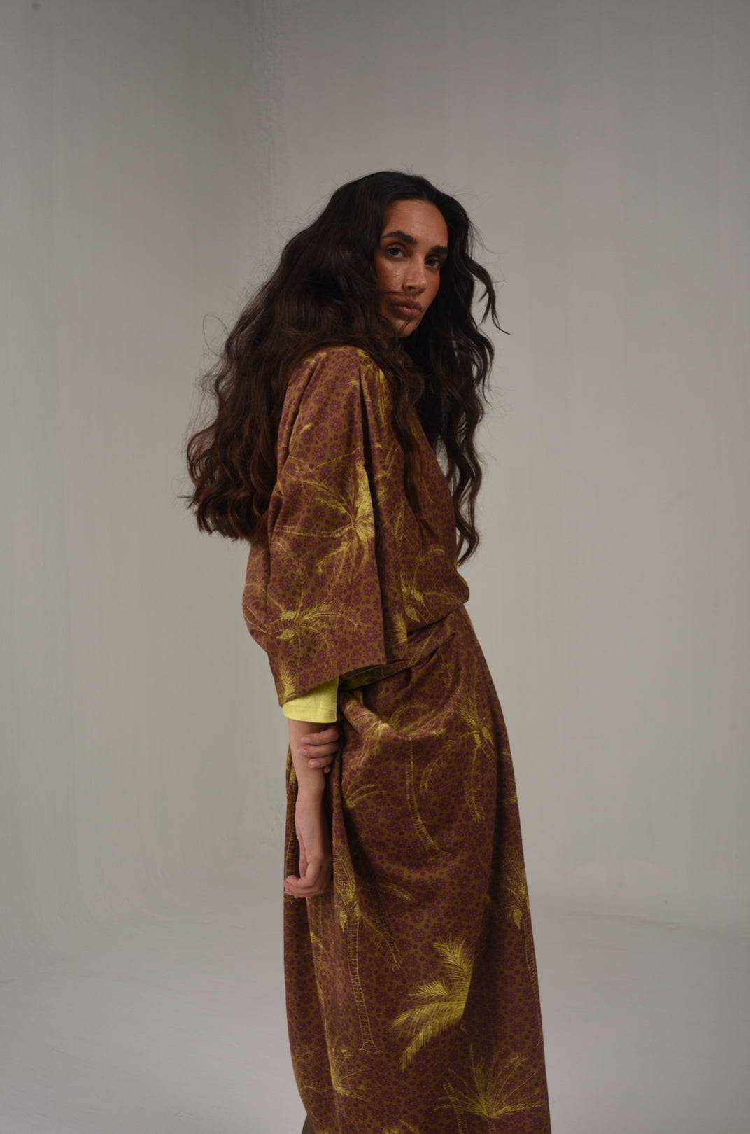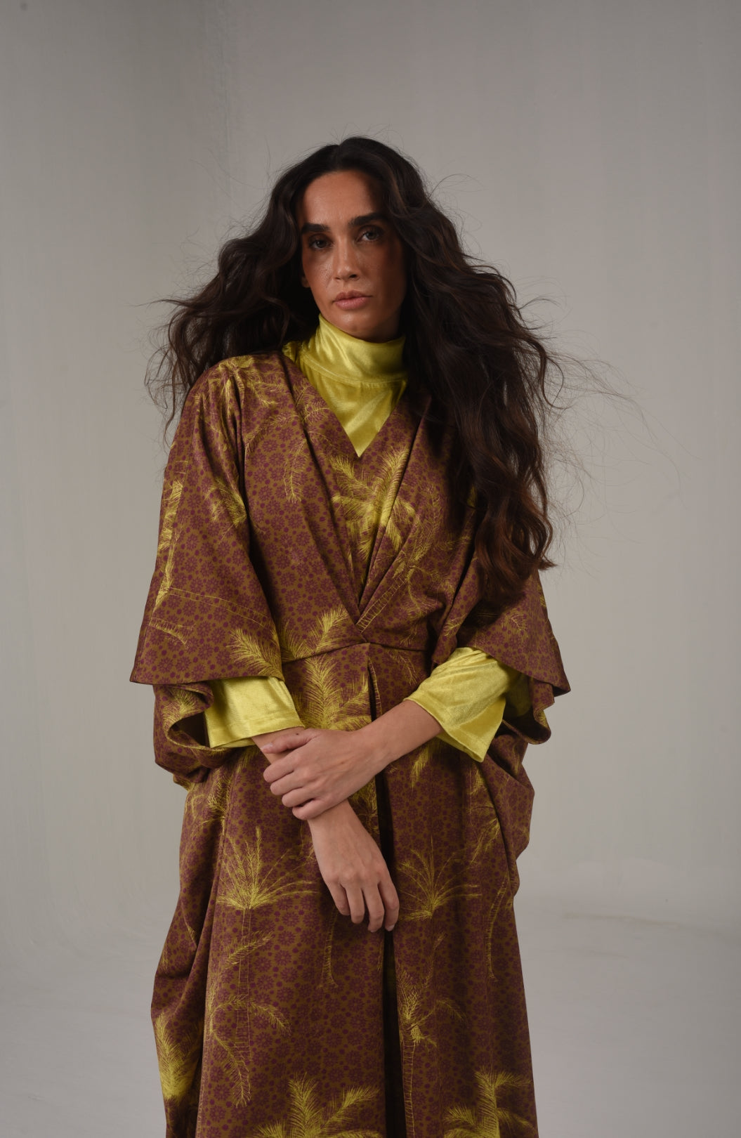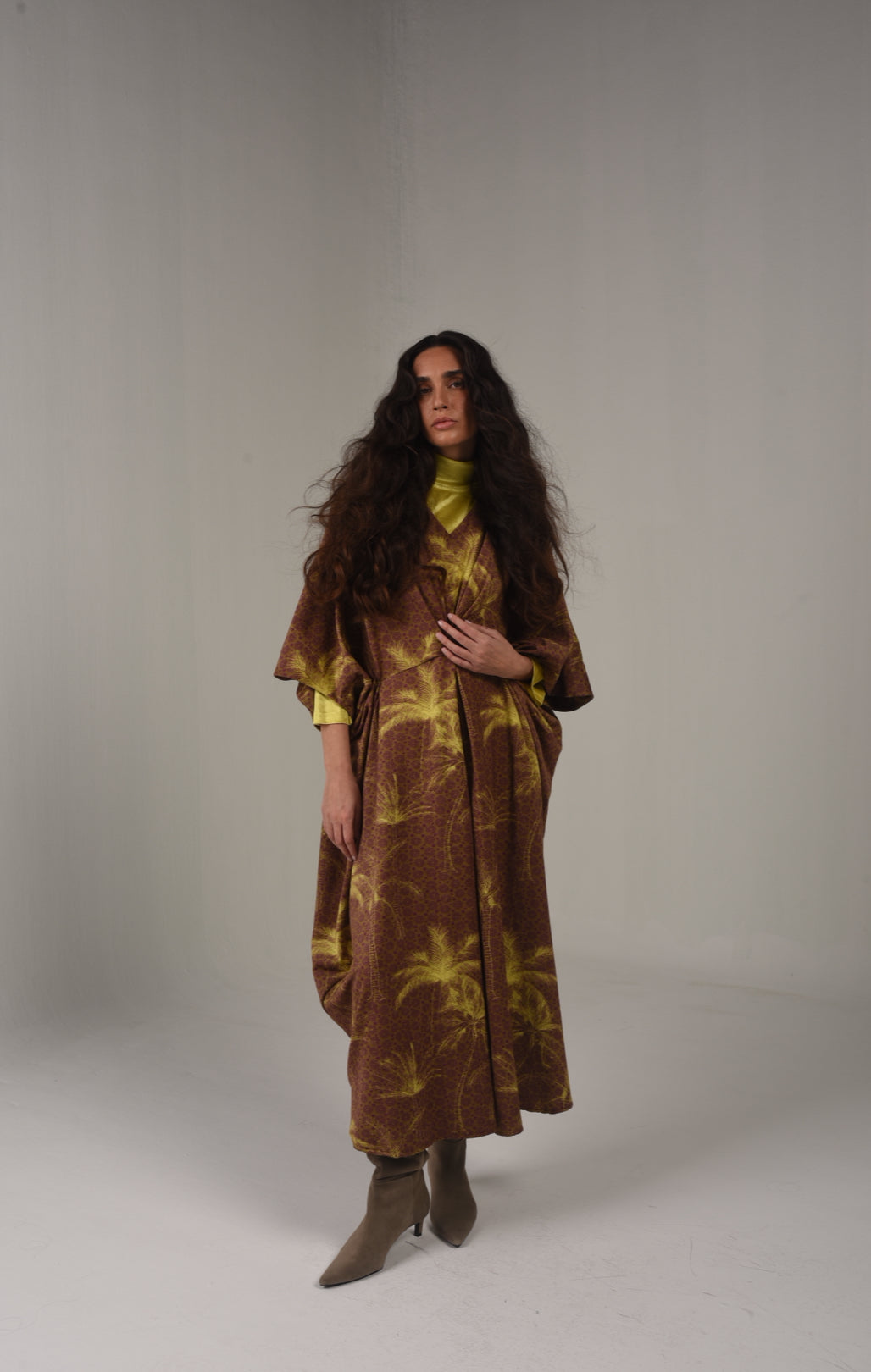 Brown kaftan shawl, adorned with vibrant yellow palm tree designs, blending earthy tones. Note: yellow high neck not included