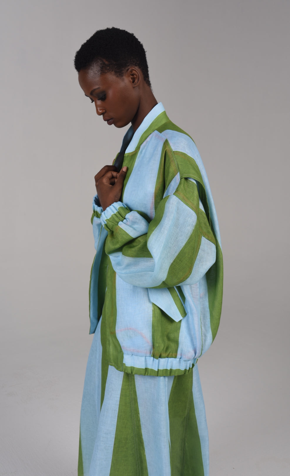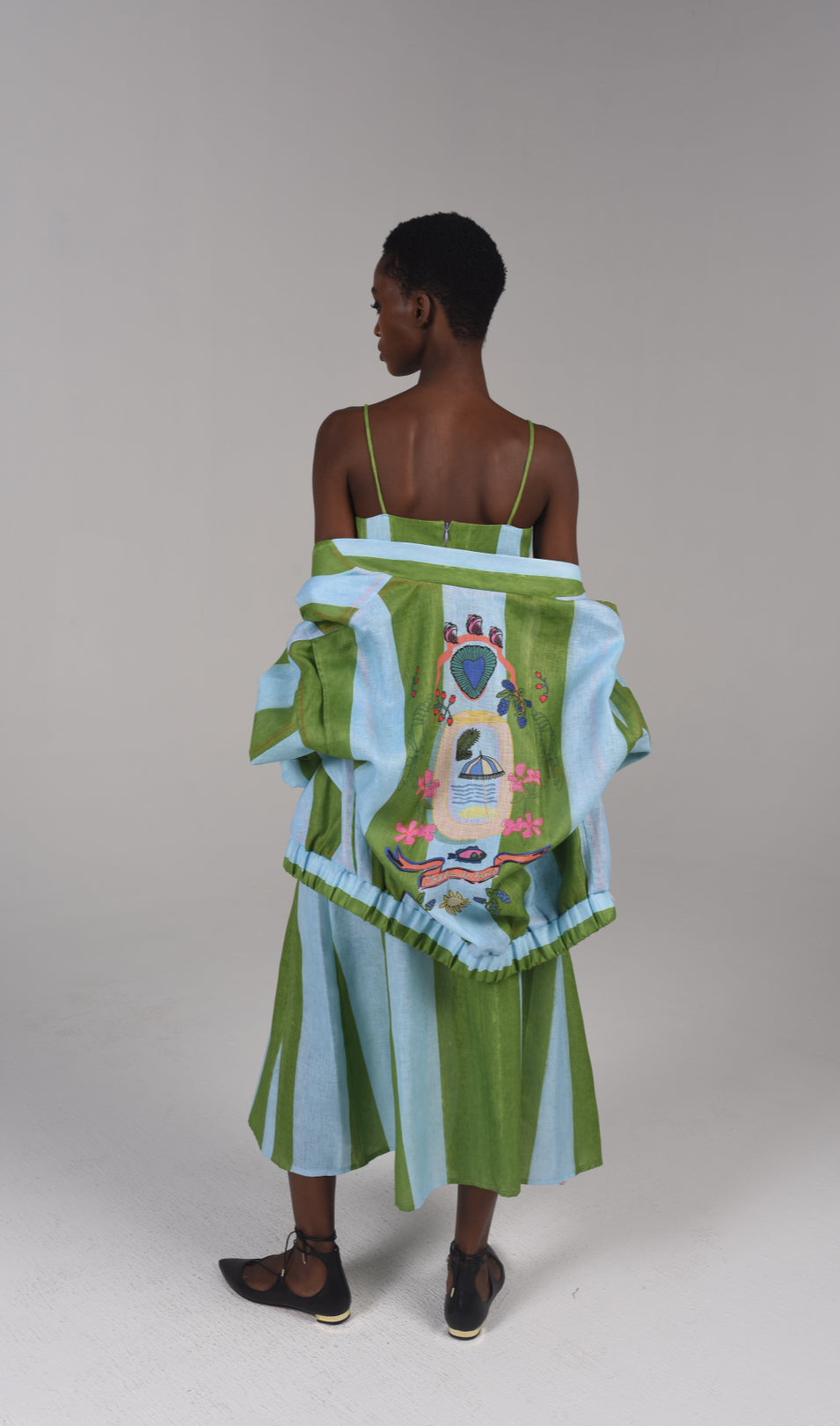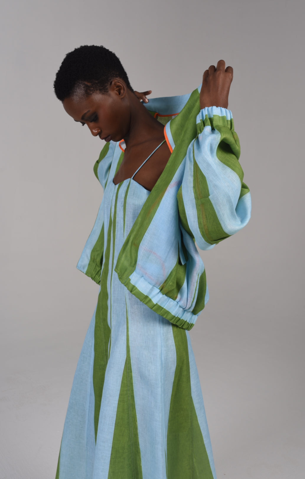 A striped sleeveless Linen dress paired with a bumper jacket.