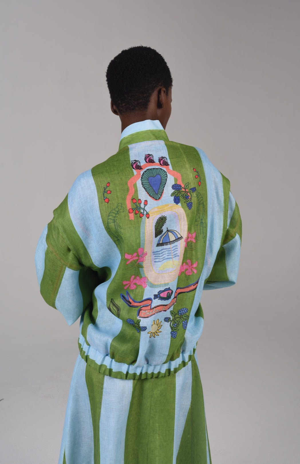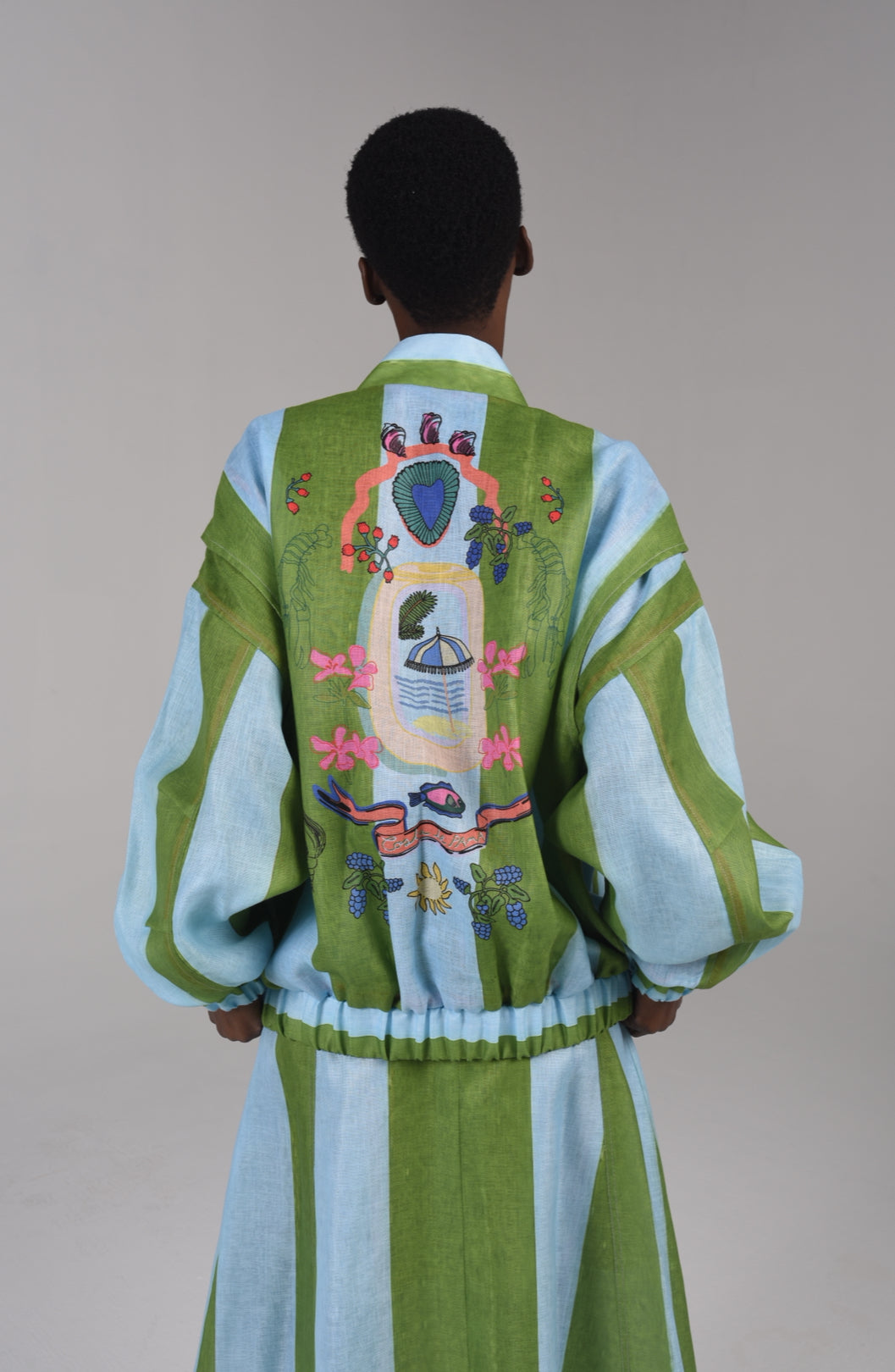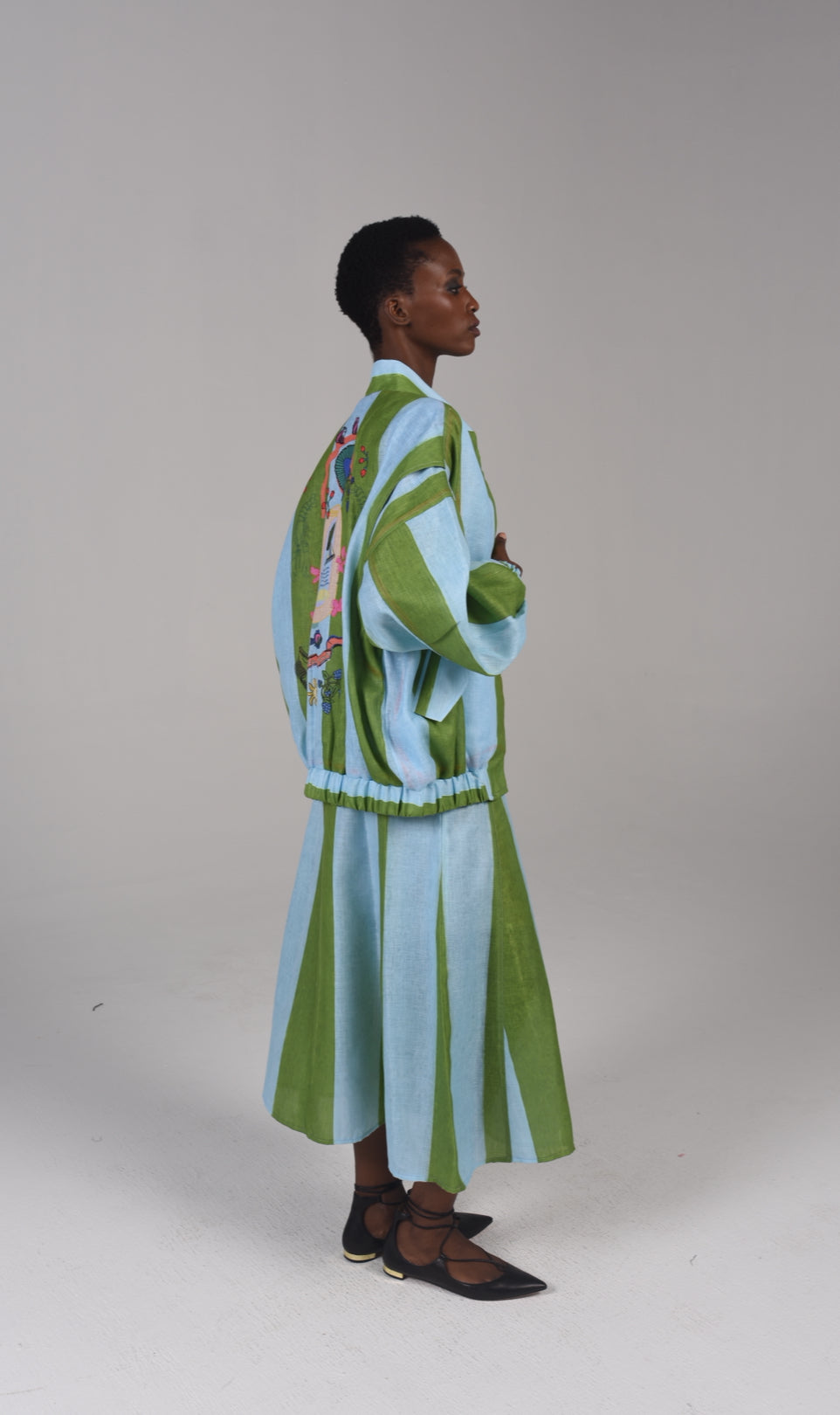 A striped sleeveless Linen dress paired with a bumper jacket.